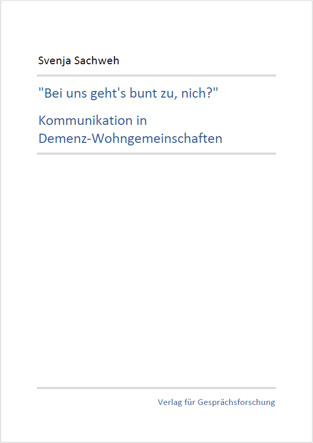 Sachweh, S. (2023). "Bei uns geht's bunt zu, nich?" Kommunikation in Demenz-Wohngemeinschaften. Göttingen: Verlag für Gesprächsforschung.